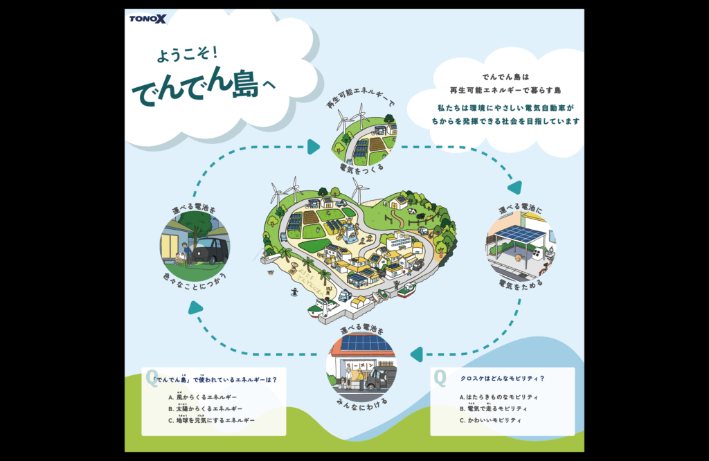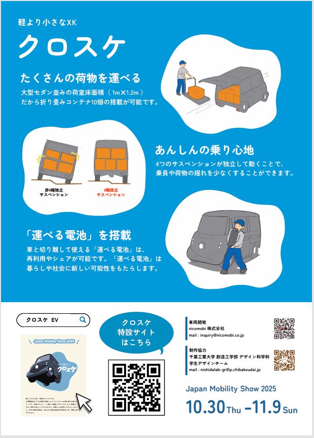 nicomobi株式会社(本社:神奈川県厚木市、代表取締役:平井敏郎)は、2025年10月30日(木)~11月9日(日)(一般公開:10月31日(金)~)に東京ビッグサイトで開催される JAPAN MOBILITY SHOW 2025において、株式会社トノックスブース(東ホール、小間番号:E7314)に、超小型EV「クロスケ」、軽トラコンバートEV「そらまる」を実機展示するとともに、クロスケ・そらまるが活躍する近未来の世界観を表現したコンセプトブース『でんでん島』をお披露目します。本ブースのデザインや会場配布物には、産学連携プロジェクトによって生まれた学生たちの自由な発想がふんだんに取り入れられています。